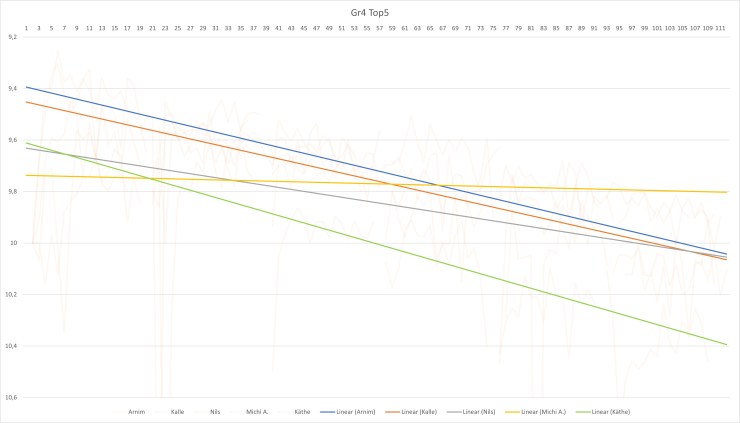 auf mehrfachen Wunsch hab ich für euch noch eine weitere kleine Analyse. Diesmal bezogen auf die Top5 Fahrer, unabhängig von der Spurfolge. Also quasi so wie jeder gefahren ist. Natürlich habe ich die Terrorphasen und individuelle Abflüge rausgerechnet. Diesmal habe ich eine lineare Trendlinie draufgelegt.